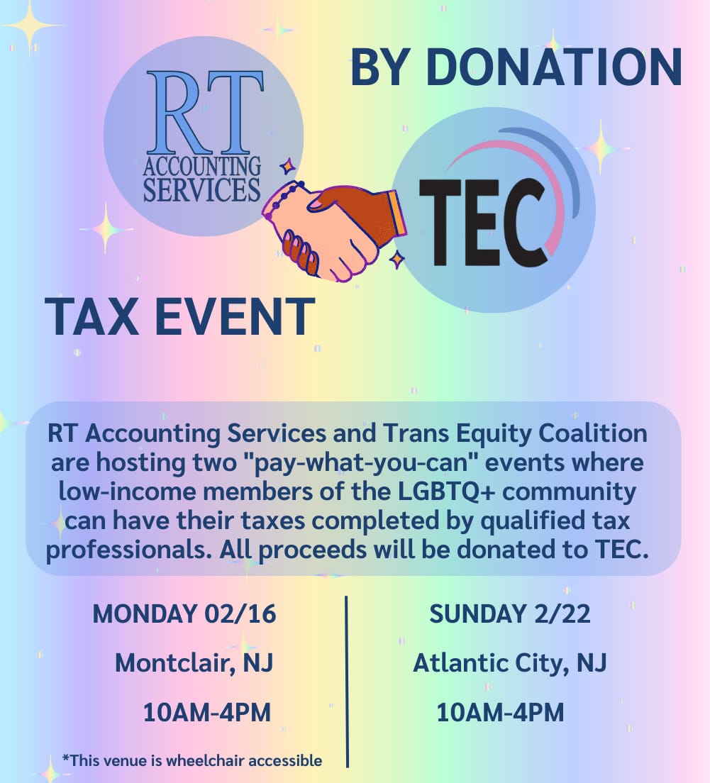 We are hosting two by donation tax preparation events with Trans Equity Coalition (TEC). All donations will go to TEC, which is a non-profit serving all of New Jersey. You can read more about what they do and who they are here.